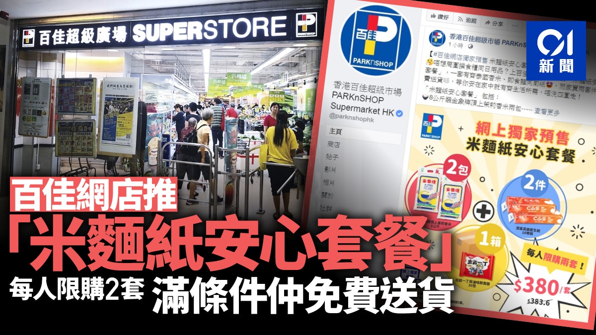 新冠肺炎(武漢肺炎)影響下,本港出現「搶購荒」,糧食及衛生紙均是搶購目標。百佳超級市埸於Facebook專頁宣布,市民可在百佳網店預訂「米麵紙安心套餐」,套餐包括:2包8公斤裝金象牌頂上茉莉香米、一箱出前一丁麻油味即食麵(30包)和2件潔柔高級衛生紙10卷裝,每人限購2套。百佳表示,若客人在網店購買2套「米麵紙安心套餐」,可獲免費送貨,「等你安在家中就有齊生活所需,唔洗四圍走!」